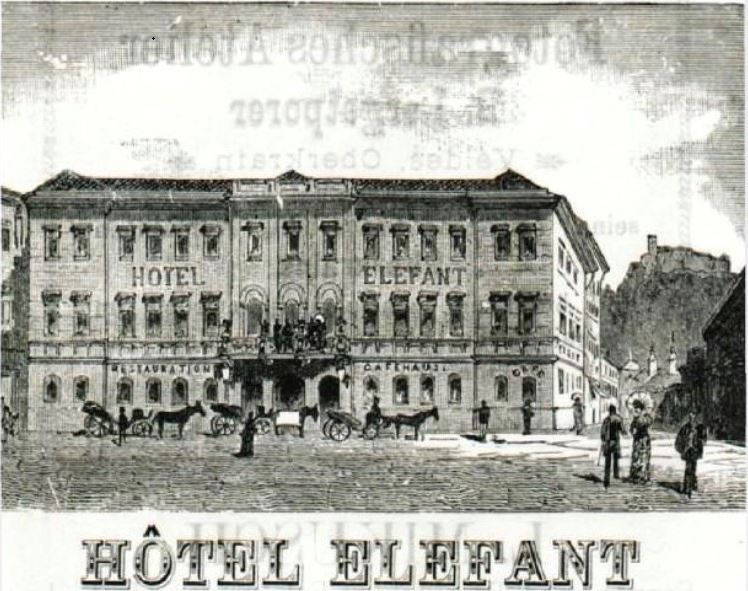 Po arhivskih podatkih je bilo na tem mestu že leta 1616 plemiško posestvo, nato vrt z zidano poletno hišico, leta 1765 pa se prvič omeni gostilna. Nad njenimi vrati je visel izvesek s slonovo podobo. Parne kopeli so odprli že leta 1853, dve leti kasneje pa so gostišče razširili z dodatnim nadstropjem. Leta 1860 so dodali še kavarno.