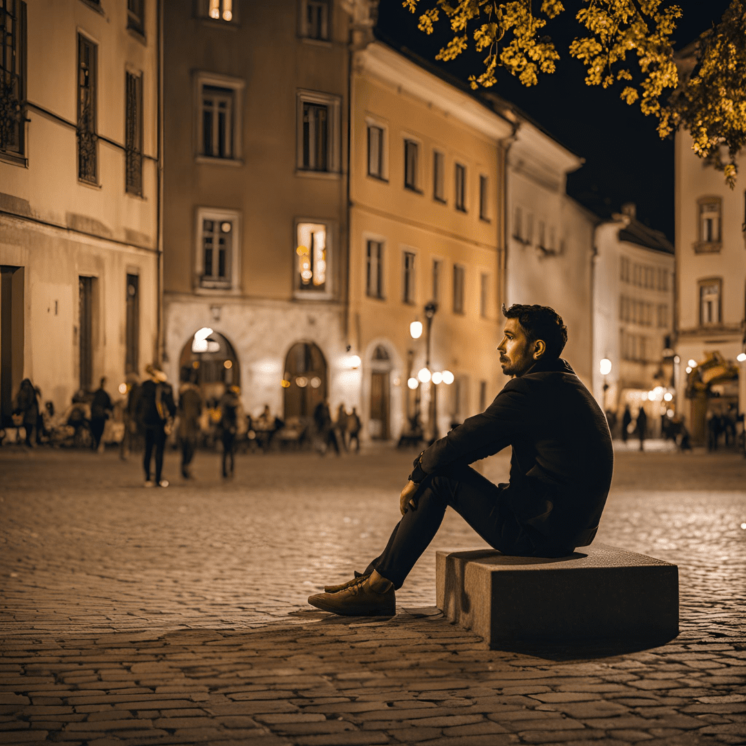 Ob robu pločnika opazim starejšega možakarja, ki si prižge cigareto in mirno opazuje vrvež. V njegovih očeh je nekaj nostalgičnega, morda spomin na pretekle petkove večere, ki jih je preživel v istem mestu, a z drugačnimi obrazi. Njegova prisotnost prinaša tiho zgodbo, ki se prepleta z energijo mladosti okoli njega.